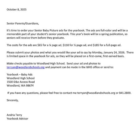Send your ad and photos to terryan@woodlandschools.org and payment can be made in the WHS office or sent to: