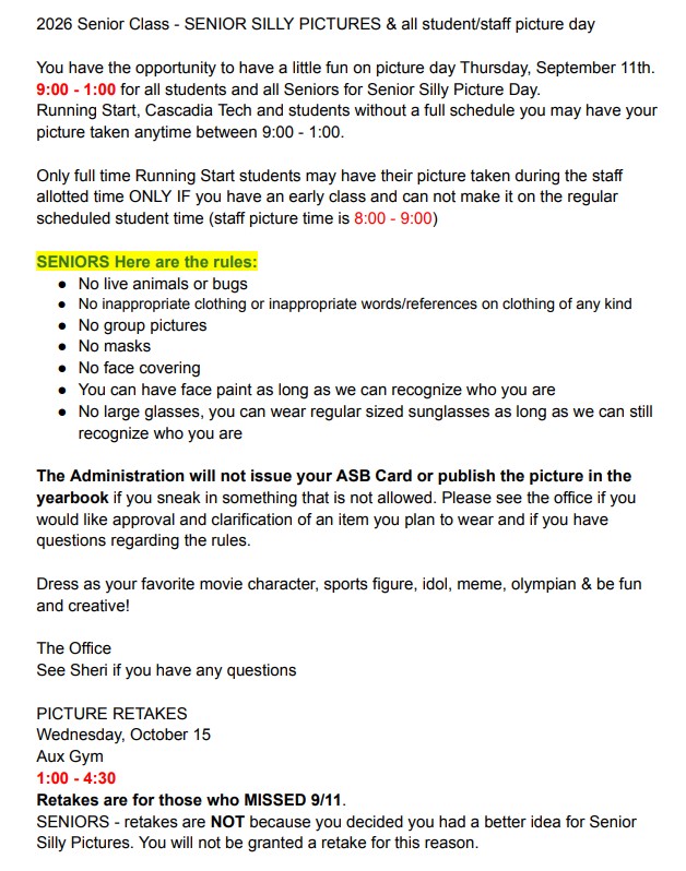- Letter re: Senior Silly picture day rules is posted below and on the Senior Information page. See retake info below Senior Silly Picture rules.