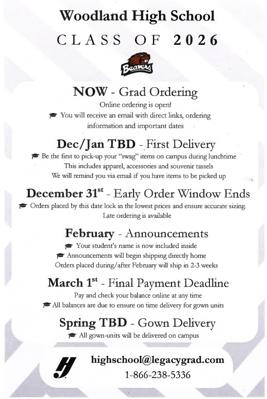 Mr. Woodland is Back - ticket sales NOW in the WHS office, $15 per ticket, contact Mrs. Terry for VIP seating (see attached letter) - Event is Thursday, November 20November 2025CLASS OF 2026 - HERFF JONES IS YOUR 'GO TO' FOR CAP, GOWN, TASSEL, STOLE, ANNOUNCEMENTS AND MUCH MORE! Herff Jones Contact Information Herff Jones QR Code for Ordering Please follow the directions that are on the QR page, this will take you exactly where you need to be for the 4 piece package that WHS required (cap, gown, tassel, stole approx. $53) DIRECT LINK: cap, gown, tassel, stole SCROLL TO THE BOTTOM LEFT OF THE PAGE Herff Jones Year at a Glance Information - what to expect